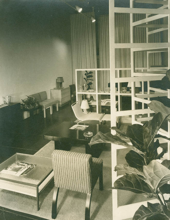 Interior of VKG shop in Los Angeles 1939. The earliest surviving photo of VKG. Hendrik designed the lights on the ceiling since there were no acceptable modern lights available at the time. Note the gate leg screen on the right, a design he incorporated for shelving and tables. The table in the left foreground has a lower shelf made of wrapped marine cord. |
